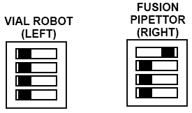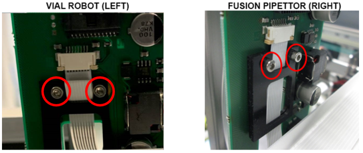 The Fusion Pipettor arm has two black strain relief brackets, while the Vial Robot has one.- Unlock the flex cable connector clamps