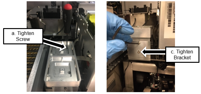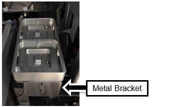 - Insert the bracket screws and loosely tighten. Shift the bracket upwards, while shifting the Fiber Cleaner Nest down, such that the bracket clamps the Fiber Cleaner Nest to the frame. Then tighten the screws.