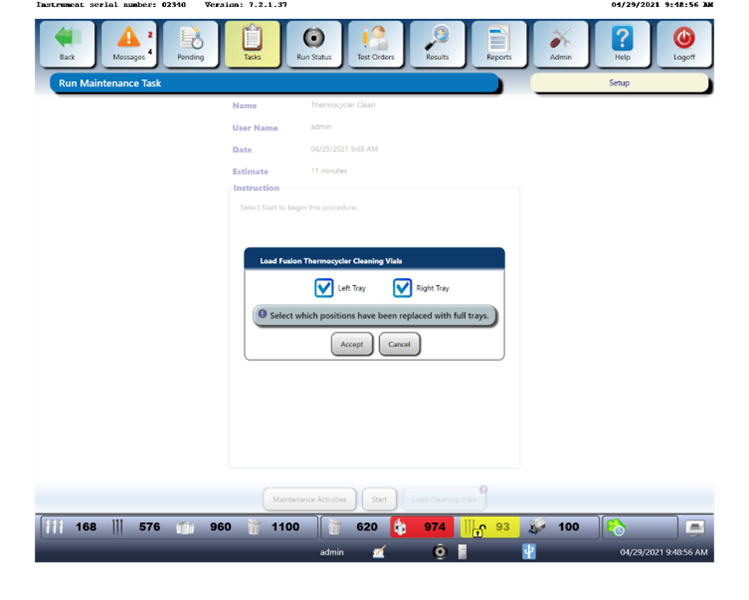 Load two full cleaning nests. Select both the Left and Right trays and click Accept.