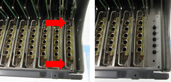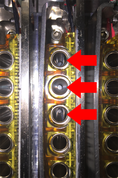 IMPORTANT! Visually check the alignment of the fiber optics in the well, they should be centered in the well. The following image is an example of INCORRECT alignment. The arrows are pointing to misaligned fibers.