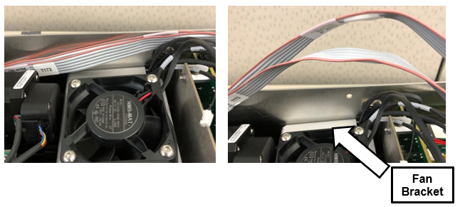 Lift the gray and pink ribbon cable to make room for the fan bracket to slide upwards.