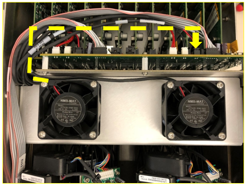 Unplug the 2 fan cables and the 2 thermistor cables from the top circuit board.