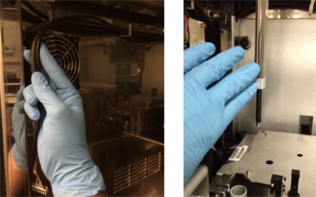 communication cables, power cable, and both Pipettor arms are clear from the area above the Thermocycler. Move the pipettors as far to the front right side of the system as possible.
