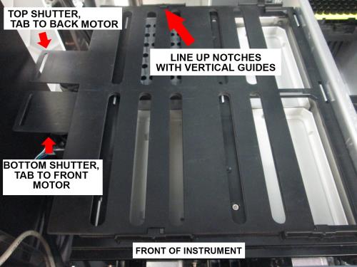 - Hold both shutters together above the drawer, with both tabs on the left. The top shutter should have its tab over the rear motor, and the bottom shutter should have its tab over the front motor.