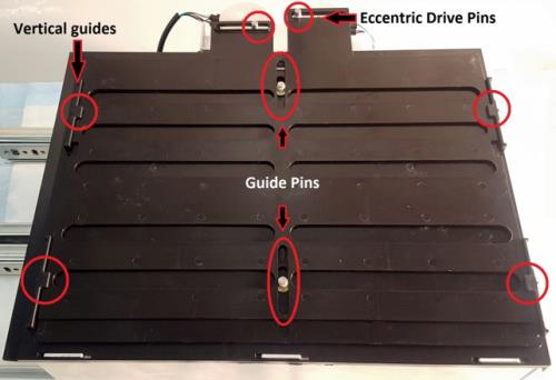 Free each shutter from the Eccentric Drive Pins. (The bottom shutter is connected to the front motor and the top shutter is connected to the rear motor. The view below is from the side, not the front.)