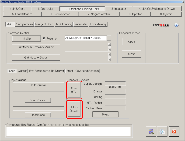 The Drawer sensor should read In, the Packing sensor should read Out, the MTU-Pusher sensor should read In, and the Packing Rear sensor should read In.- Press Unlock Drawer. Wait until the drawer unlocks and open the MTU drawer but do not open the drawer.