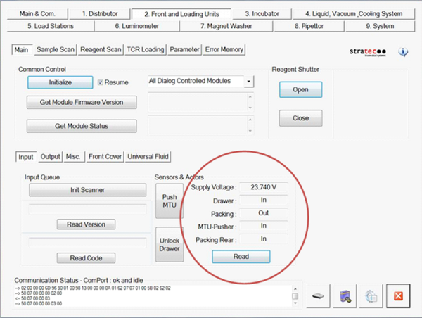 Press Read to get the sensor readings of the MTU Input Queue. The Drawer sensor should read in, the Packing sensor should read In, the MTU-Pusher sensor should read Out, and the Packing Rear sensor should read In.