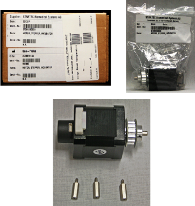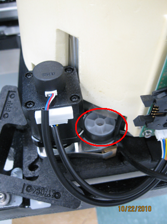 Remove the three motor standoffs, motor cable, and motor encoder cable and transfer them to the new motor assembly. Ensure the three standoffs are installed in the three hole locations on the motor body as in the picture.