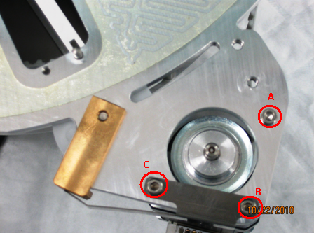 Turn the Incubator upside down to access the three screws (A, B, and C) that secure the motor.