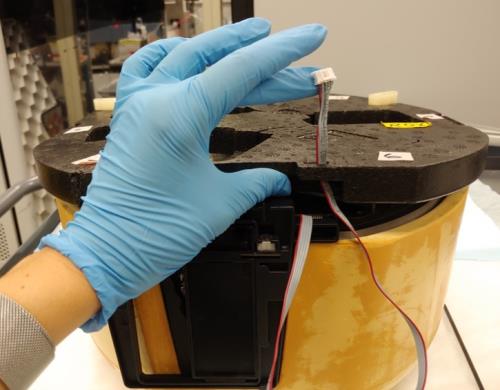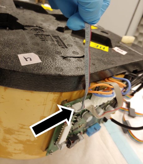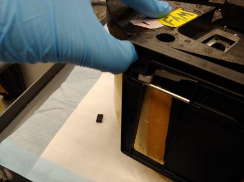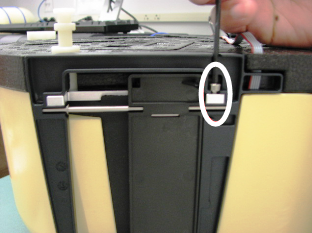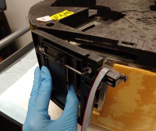 - Remove the bottom foam from the Incubator to expose the door assembly.