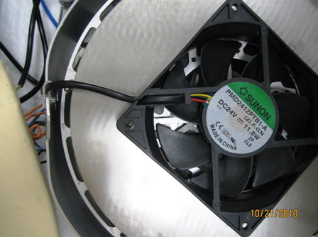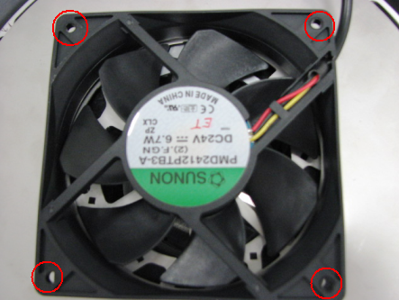 Using a 3 mm Allen wrench, unscrew the four screws that secure the fan. Note the orientation of the fan before removal.