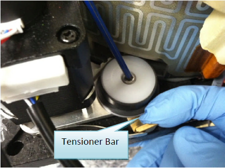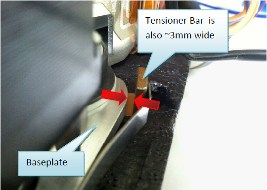 Manually rotate the carousel and allow the auto-tensioning mechanism to achieve the proper belt/motor engagement. Ensure the gap between the tension bar and the baseplate is ≈ 3 ± 1 mm.