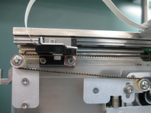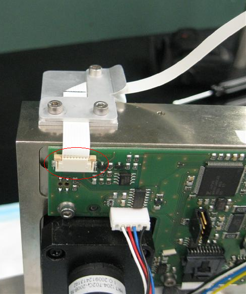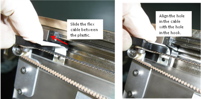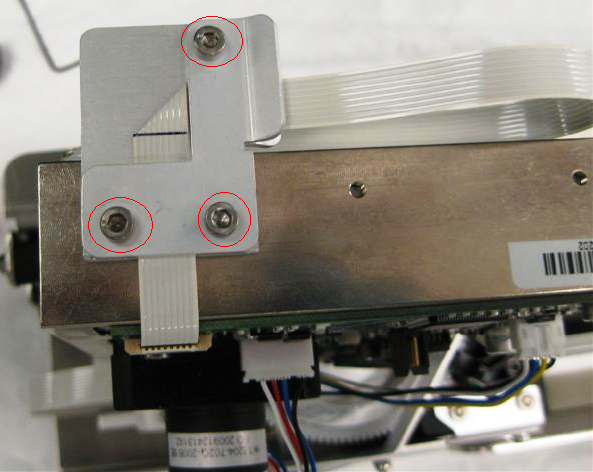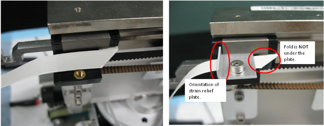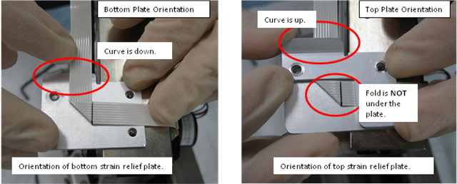 Secure the flex cable with the L-Shaped strain relief plate and replace the screws, as shown in the following picture. Note the orientation of the bends in the strain relief plates. Also, ensure that the flex cable fold is not sandwiched between the plates.- Close the Service Drawer.