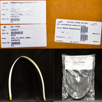 Route the hook flex cable over the plastic piece, and secure it with the square strain relief plate. Note the orientation of the curve in the strain relief plate. The following picture shows the correct orientation. Ensure that the fold is not under the plate.- Plug the flex cable into the Hook PCB, and snap the connector in place.