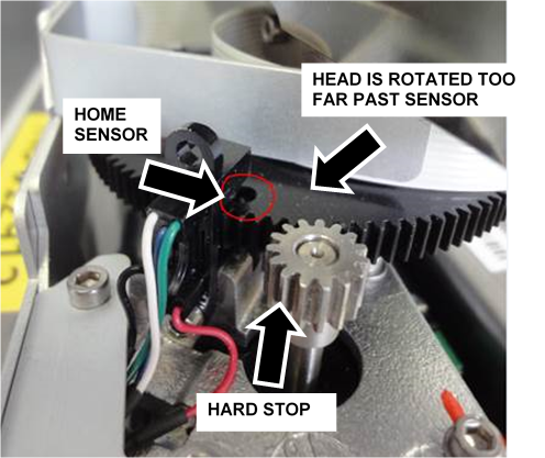 During installation or servicing of the distributor, It is possible to manually rotate the distributor head just beyond the theta home sensor (light barrier), as indicated in the picture below. If the distributor is initialized in this position, a stall of theta movement will cause initialization failure.