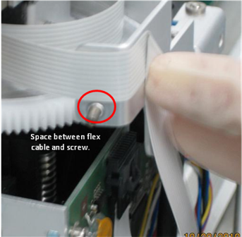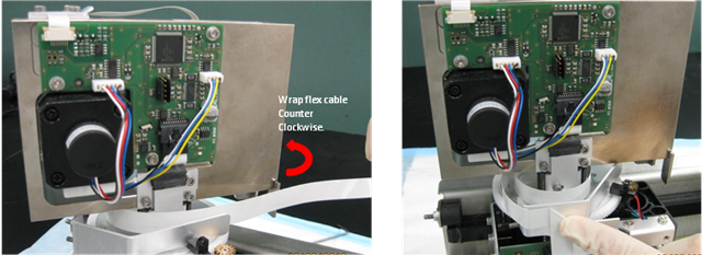 Replace the Z/Theta PCB cover. Note the correct positioning of the flex cable in the picture.