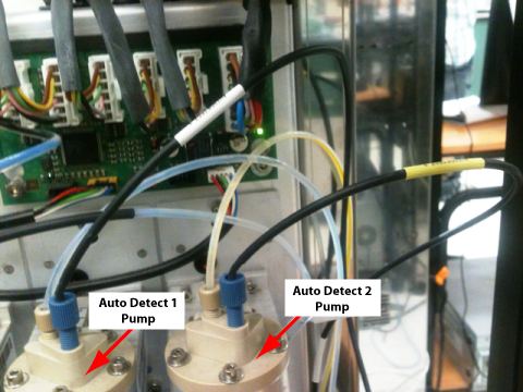 - Unscrew the luminometer injector fittings from the Auto Detect 1 and 2 pumps.