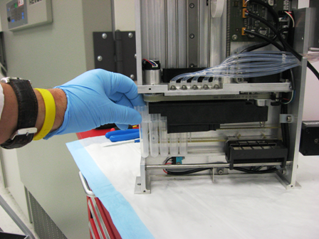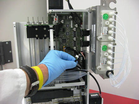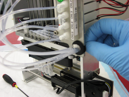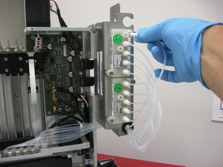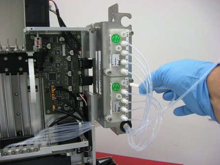 - Connect the new injector lines to the valve blocks so that the nozzle toward the front of the module is connected to the wash valve block and the nozzle to the rear of the module is connected to the oil valve block.