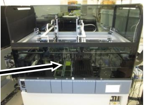 Push the Mid-Bay Drawer back in until it is about 4-6 inches from the back. Slide the Pumps Module up an inch to clear the slots (1), then move it forward (2) and gently set it on the luminometer.