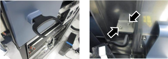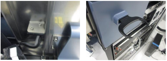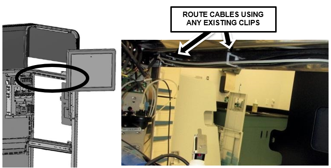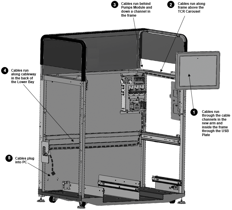 Route the new cables from behind the USB Plate back to the corner above the Pumps Module. Follow the upper edge of the frame above the TCR Carousel, and reuse the existing clips to secure the monitor cables. Route the new USB Power cable in the same manner as the old one.