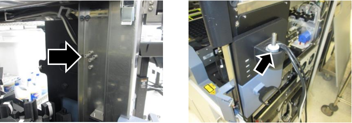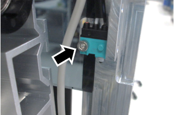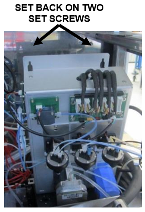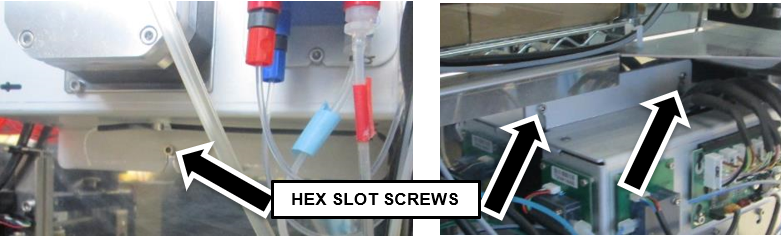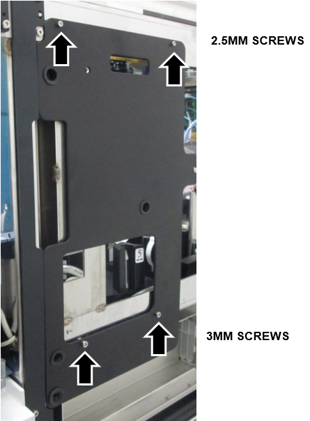 Unscrew the two screws (2.5mm hex key) holding each white plastic splitter (Oil & Wash) on the left side of the Pumps Module to allow slack in the pump tubes.
