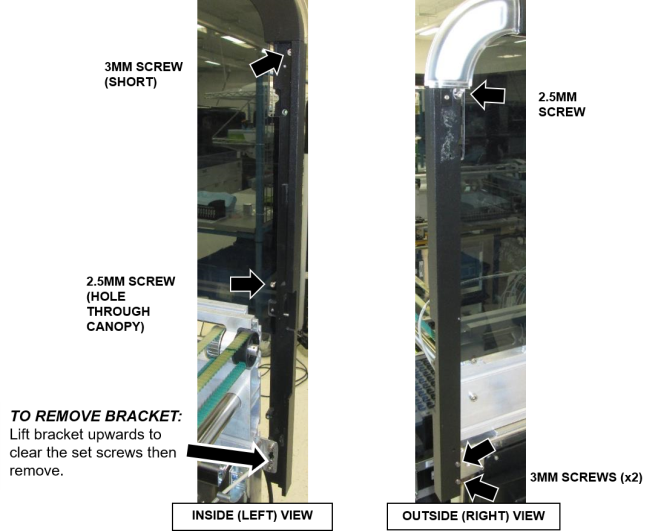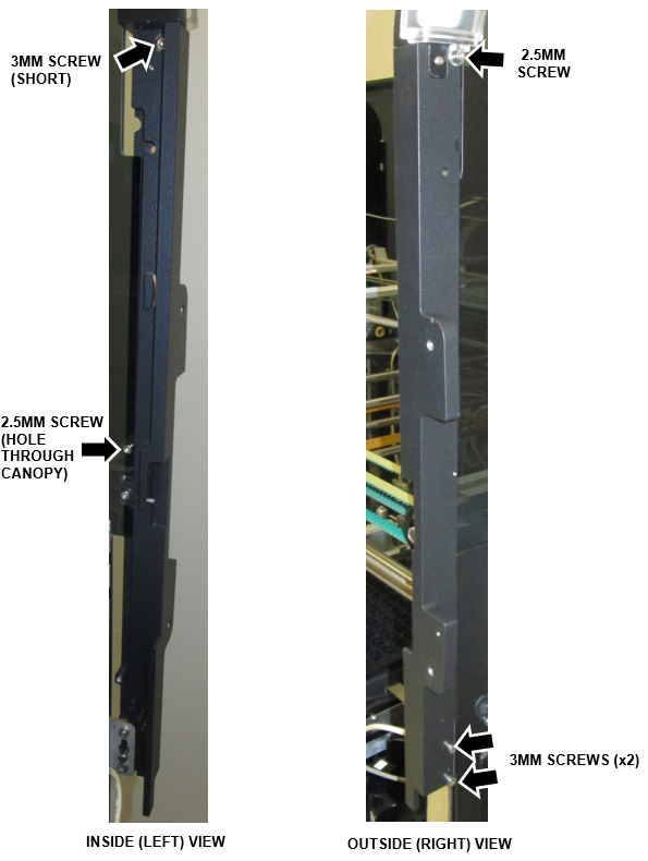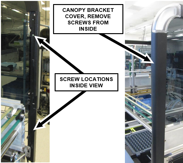 Remove the two 3mm screws holding the right canopy bracket cover to the bracket. Access the screws from the inside of the bracket.