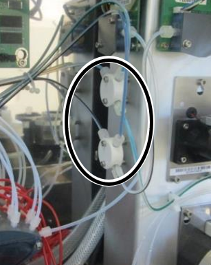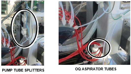 Re-attach the two Pump Tube Splitters on the left side of the Pumps Module with the (2.5mm) screws removed previously. Re-secure the OQ aspirator tubes in the clips (if present)..