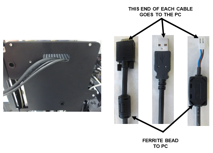 Caution—Ensure the correct end of each cable is routed through the hole for connection to the monitor. (The PC end of the VGA and power cables have a black component (ferrite bead) on the end of the cable. Do not route this end through the USB Plate.