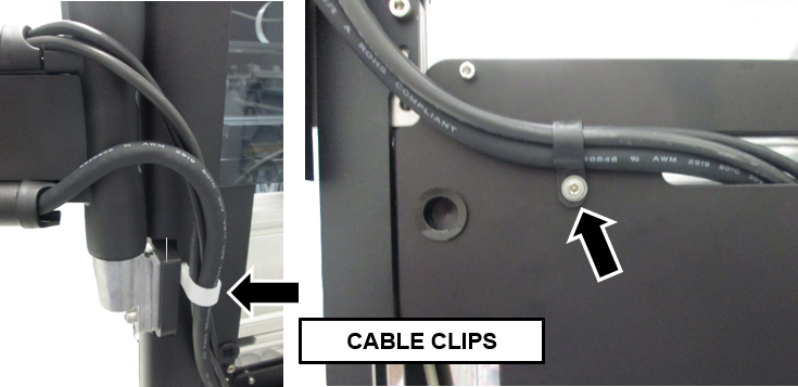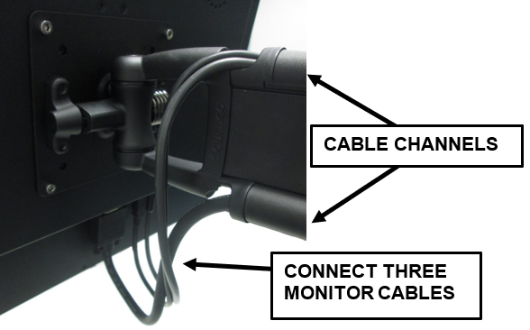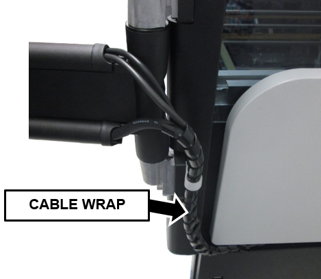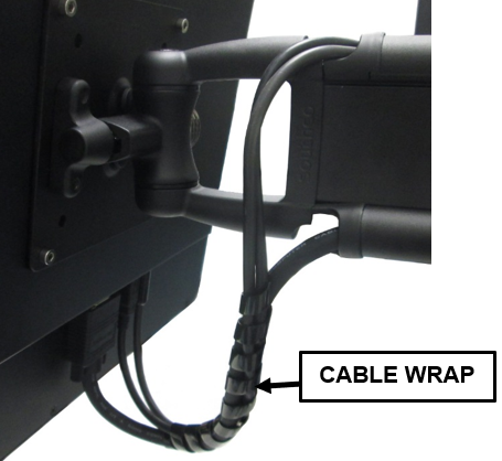Dress the cables under the monitor using the short cable wrap. Ensure there is not too much tension on the cables through the full movement of the arm.