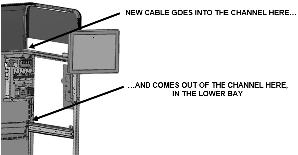 Route the new cables down the channel and into the Lower Bay. The cables should come out of the channel in the frame behind the UFD Drawer, below the Pumps Module.