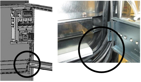Caution—When you route the cables in the back corner, ensure none of the cables or insulated water hoses will be pinched or in the way when the Mid-Bay Drawer is closed. Slowly close the drawer and visually verify the drawer can close and lock.