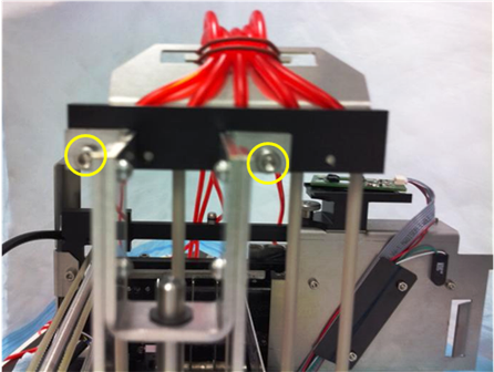 Using a 2.5 mm hex key, remove the two 2.5 mm screws that secure aspirator assembly front cover.
