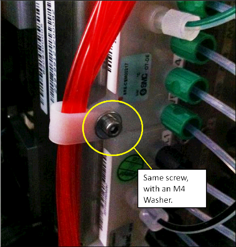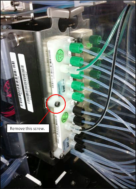 Using a 3 mm Allen wrench, remove the left screw from the wash buffer dispense manifold. Save the screw for later use.