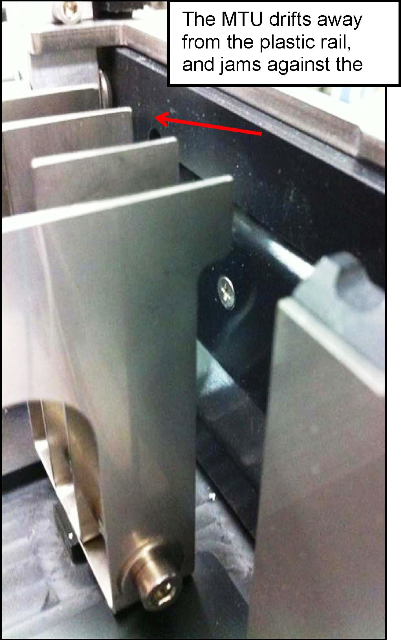 Multi-tube unit—Container used to process tests in the instrument. An MTU contains five separate reaction tubes. The MTU is moved through the instrument by the linear distributor and includes five tiplets for pipettiing to be used in the mag wash station. drifts away from the black plastic rail toward the metal rails and snags on the sharp edge of the metal rails.