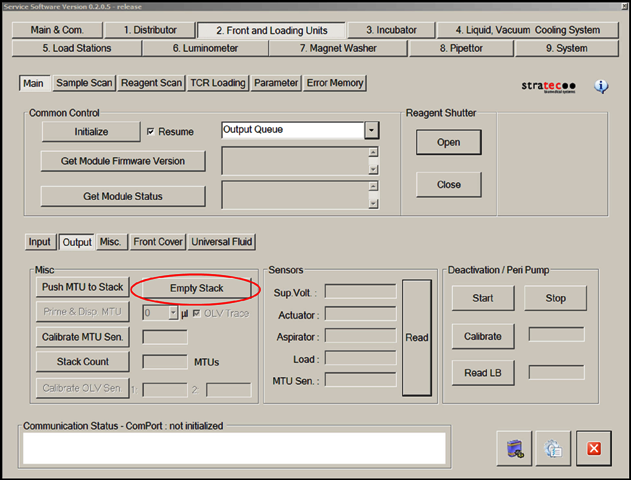 On the Front Loading Units tab, select Output and then Empty Stack to ensure that the Output Queue stack is empty.