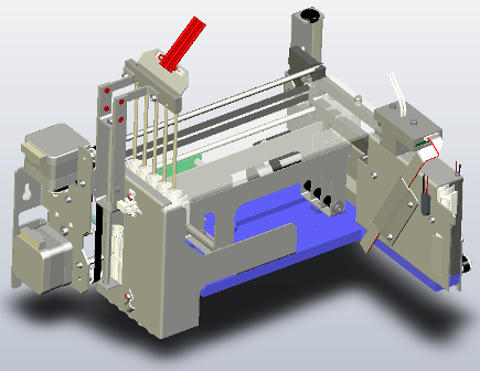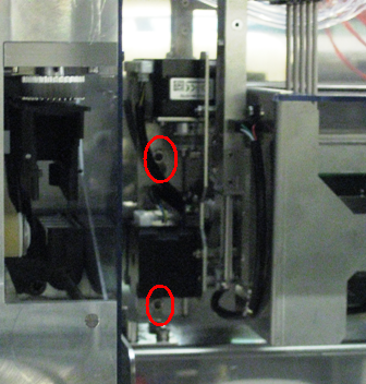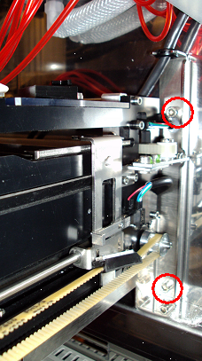 Loosen, but do not remove, the four 4 mm hex screws that secure the Output Queue to the rear wall of the Panther System. Two screws are located at each end of the Output Queue–two on the right and two on the left.- Gently lift the Output Queue up and outward to remove it from the mounting screws. The output queue can be maneuvered out of the side of the system with the service drawer open.