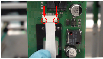 Remove flex cable by carefully unlocking the flex cable connector clamp. (See arrows in image below.)This will release the flex cable from the Pipettor Y-breakout PCB. Remove the flex cable.