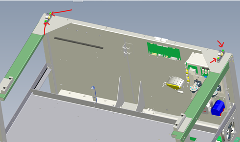 - Unscrew the 4 screws (2 per hinge located behind the rear x-axis rail).