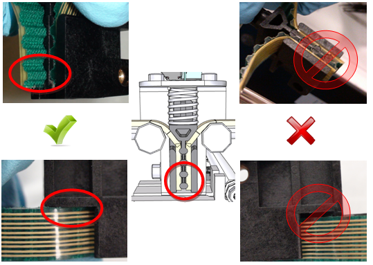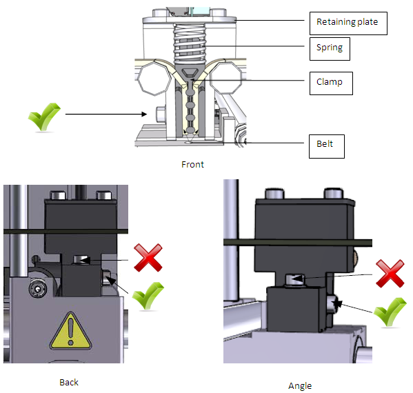 Attach one end of the belt to the clamp. Make sure the last tooth is positioned as shown in the following image. The belt should also be fully seated in the clamp so there is no gap.