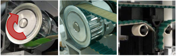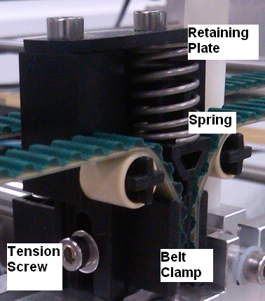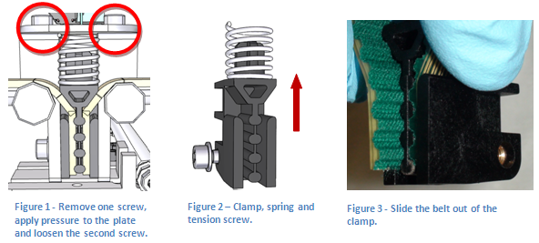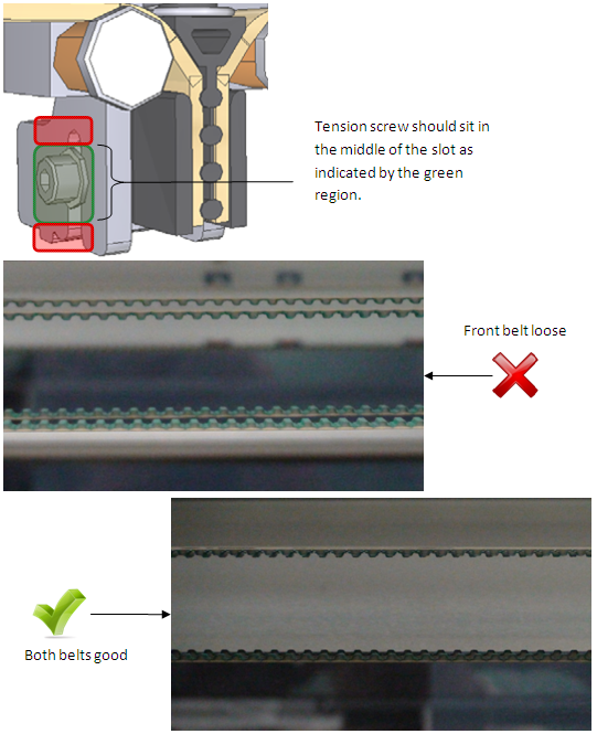 Verify the position of the tension screw is roughly in the middle of the tension slot. The screw should not be seated against the top or the bottom. If the screw is seated too high or too low the belt is not seated correctly on the pulley. Screw sits too high: there is not enough belt between the toothed gear and the tension assembly. Screw sits too low: there is too much belt between the toothed gear and the tension block assembly. Adjust the belt in the proper direction so the screw sits in the correct position.