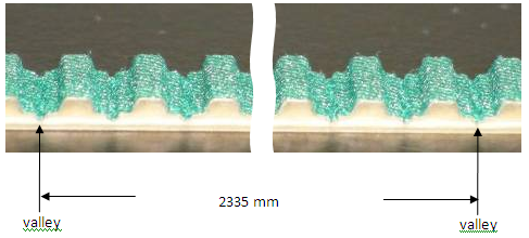 Verify that the new belt length is 2335 mm; if it is not, cut the new belt so that it has the same number of teeth as the old belt. When measuring the new belt, measure from valley to valley of the belt as depicted below.