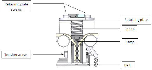 Loosely thread the tension screw into the assembly. Seat the spring in the correct position and secure the retaining plate using the two screws.