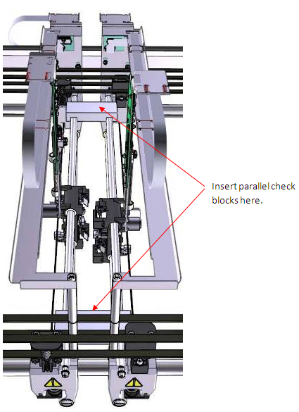Verify the pipettor arms are parallel. Use the blocks to check the pipettor arms are parallel. Set the first block at one of the ends shown in the diagram below. Place the second block at the other end allow to seat itself, do not force it down. If the block does not seat itself, determine which pipettor arm is out of position. Adjust the belt accordingly.