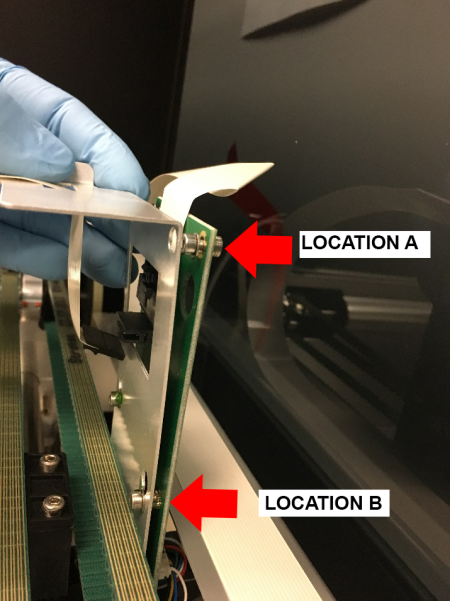Loosen the 2 screws (Location A) securing the X-Axis Cable suspension bracket from the X-Axis sledge PCB. Loosen the lower screws (Location B) to allow the PCB relief from the X-axis sledge.- Depress the clip and remove the X-Axis Flex cable from the X-Axis Sledge PCB.