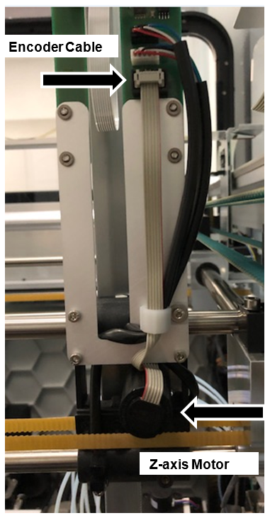 - Connect the Z-axis motor encoder cable to the Y-Sledge PCB and cable strain relief, routing the cable in the same manner as noted in Step 5.