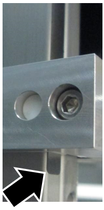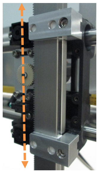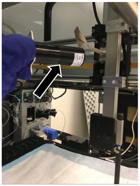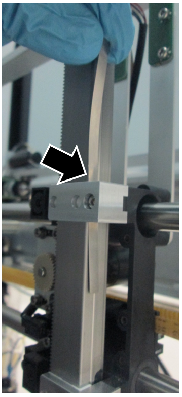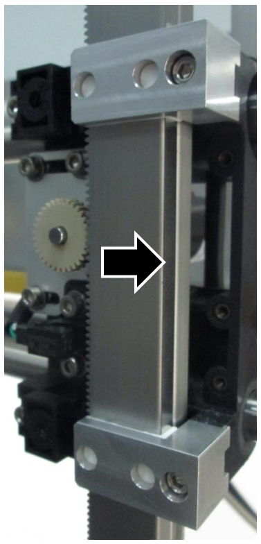 Slide the Mesh Shim Tool in between the pipettor and slide bearing as shown. The tool should extend about 5mm past the top and bottom slide bearing.