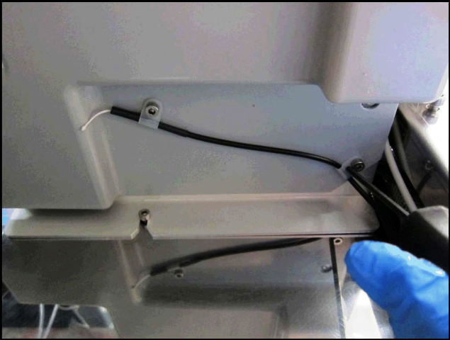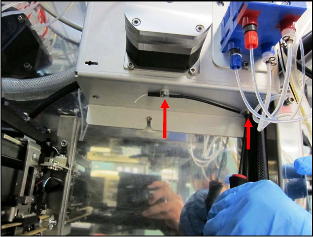 Using a 3 mm Allen wrench, remove the two M4 screws that secure the cable to the bottom Pumps Module.