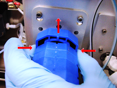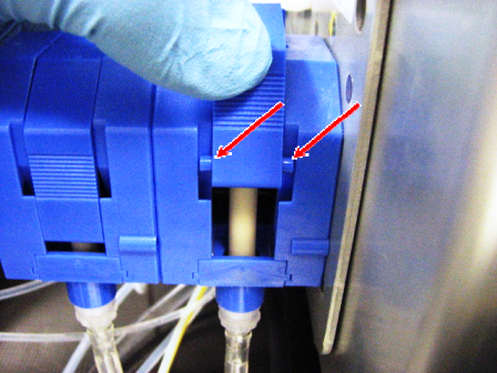Press on both release points on the rear (BLUE) Peristaltic Pump housing top cover and pull upward to remove the cover.