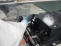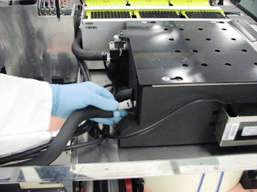 Connect both of the liquid cooling lines by pushing in and turning clockwise. The tubing that connects to the sample bay should be connected to the left fluid connection when viewed from the rear of the bay.