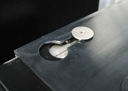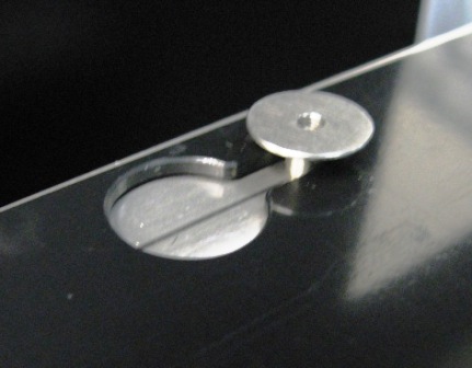 While lifting the actuator tab over the actuator pin, slide the cover into position so that the four retainer heads are properly seated in the keyhole slots.